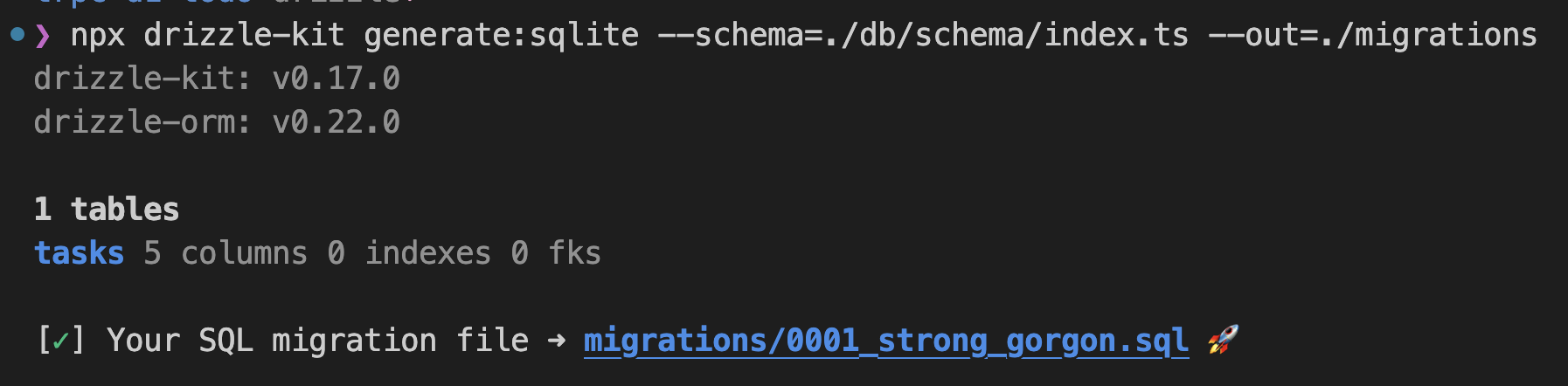 npx drizzle-kit generate:sqlite --schema=./db/schema/index.ts --out=./migrationsAfter running the command, you should see the following: